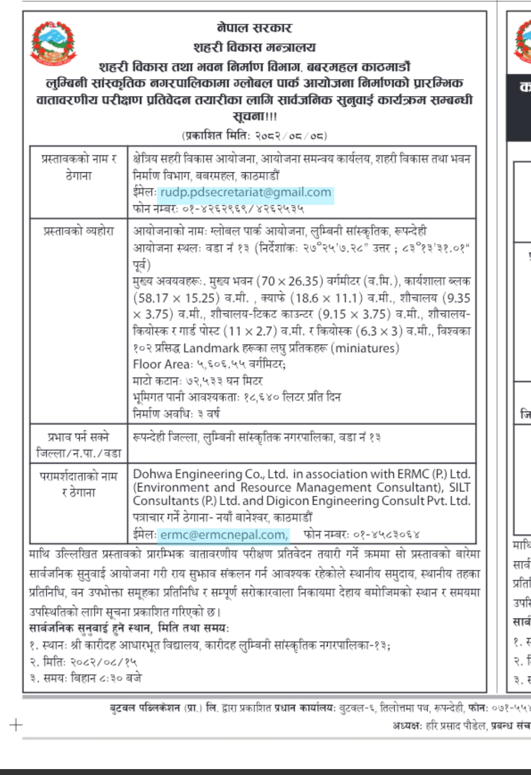 लुम्बिनी साँस्कृतिक नगरपालिकामा ग्लोबल पार्क आयोजना निर्माणको प्रारम्भिक वातावरणीय परिक्षण प्रतिवेदन तयारीका लागि सार्वजनिक सुनुवाइ कार्यक्रम सम्बन्धी सूचना।