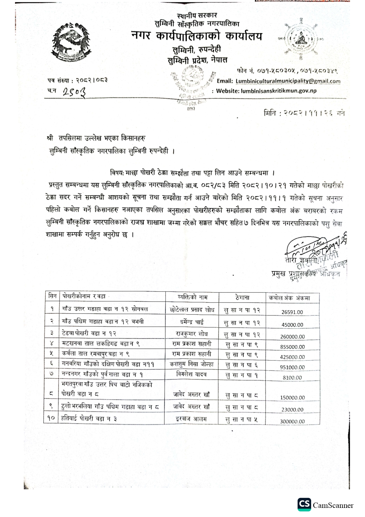 माछा पोखरी ठेक्का सम्झौता तथा पट्टा लिन आउने सम्बन्धी सूचना ।